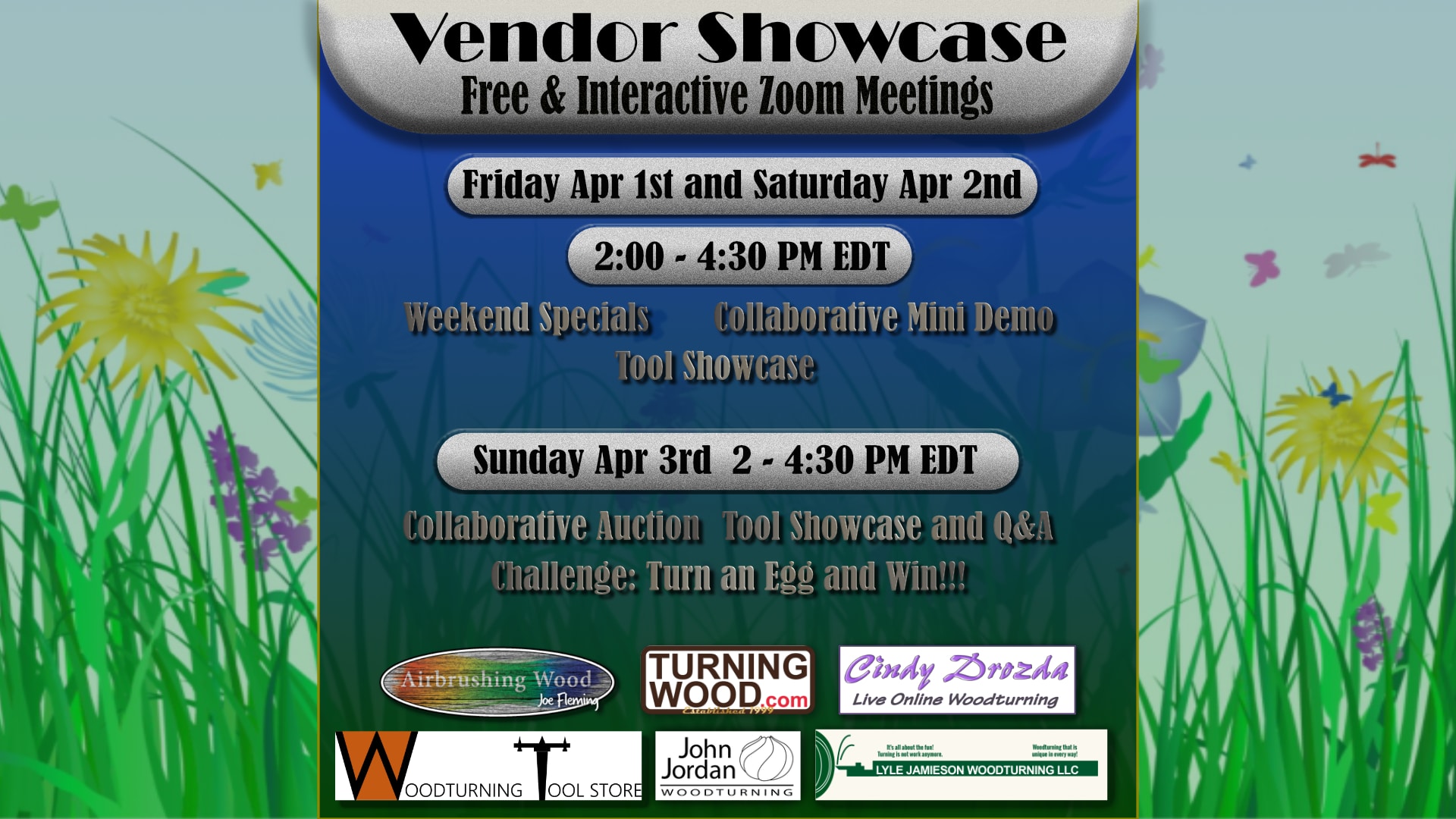 Celebrate spring with the Vendor Showcase team! Please come and join Tod Raines (Woodturning Tool Store), Cindy Drozda (Cindy Drozda, Fine Art of Woodturning), Joe Fleming (Airbrushing Wood), John Jordan (John Jordan Woodturning), Lyle Jamieson (Lyle Jamieson Woodturning, LLC) and Steve Worcester (Turningwood.com) for 3 days of fun! We’ll have Show Specials, Collaborations, Mini-demos, Tool Showcase, Q&A, and Social time. Participate in the Egg Challenge, and win a prize! Turn an egg with us, or turn one ahead of time.